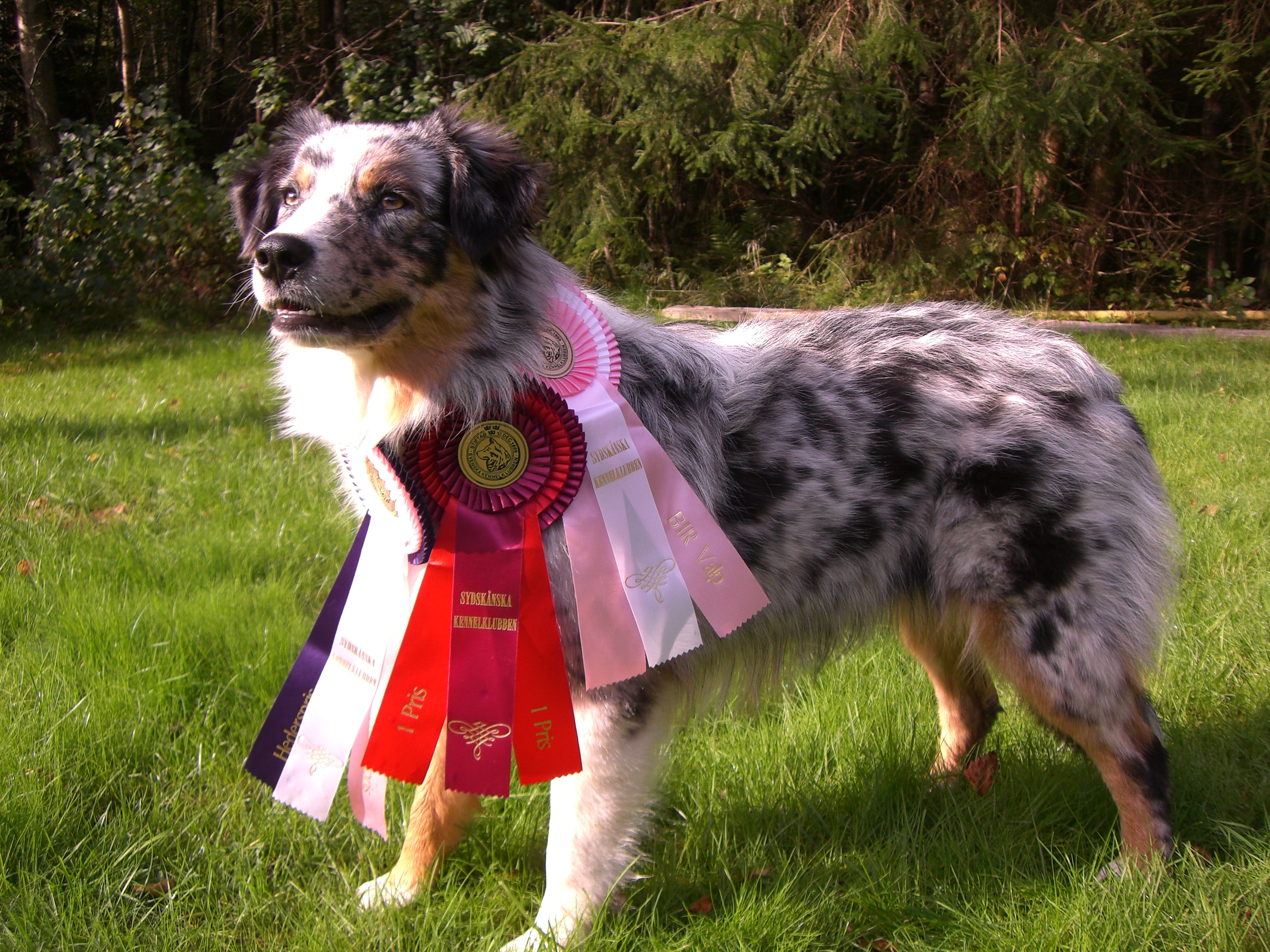 Vips sa det så var redan killarna inne i ringen och det var bara för mig och Nea att springa bort och ställa oss beredda. Av våra killar blev Nemo 1:a hp och Norton 2:a hp. Nea gick mot en svart liten tös som jag tyvärr inte hann se så mycket av och blev 1:a med hp, Makea var tyvärr inte med då hon fick stanna hemma och krya på sig. Snabbt in igen och nu mot brosan Nemo. Vi fick våra rosetter och jag tackade så mycket och gav Pernilla en grattiskram och fattade inte varför de sa till mig att vi skulle in i finalen senare? Jag tittade på rosetten och såg att det stog BIR på, jisses vad roligt det var för jag antog att Nemo fick BIRet då dom stod placerade innan oss. Det är verkligen roligt att vi så många gånger får möta varandra och hålla det inom familjen ;0)