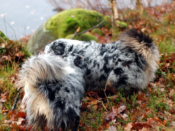 Idag åkte jag och Nea ut till Hedared för att hälsa på Kicki, Mats & Molly. Vägen dit var verkligen intressant. Gps:en valde en genväg som visade sig vara en riktig senväg, liten krokig grusväg upp över ett berg med stup på sidan och inge rum för möte över huvud taget! Men fram kom vi till slut och Nea fick äntligen springa lös och mysa med Molly. Denna gången gick ännu bättre än förra och Molly var ängelen själv!! De två blå busade bäst dom kunde och väl hemma delade de även på märgben som Nea delat mitt itu. Nea har ju en förkärlek att ligga nära och tugga och Molly fann sig i det utan större problem :0) Ett riktigt trevligt besök!!