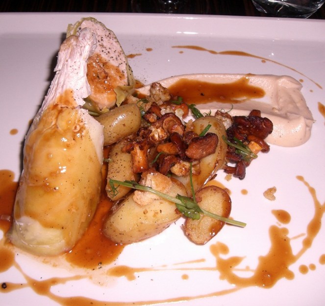 Jag åt Pärlhönsbröst med spetskål, tryfferad blomkålspuré, kantareller, brödsmulor & vinägersky. Ljuvligt!