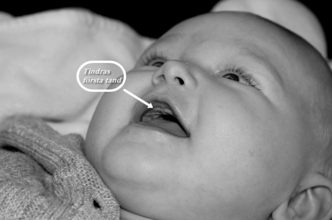 En annan rolig sak är att Tindras första tand är här!! Den försvann dock igen men enligt barnmorskan var det inte helt ovanligt då tandköttet svullnar lite i processen, himlans kul är det i alla fall. Tänk att mitt lilla hjärta redan börjar få tänder!! Själv var jag runt 9 månader när jag fick min första tand.
