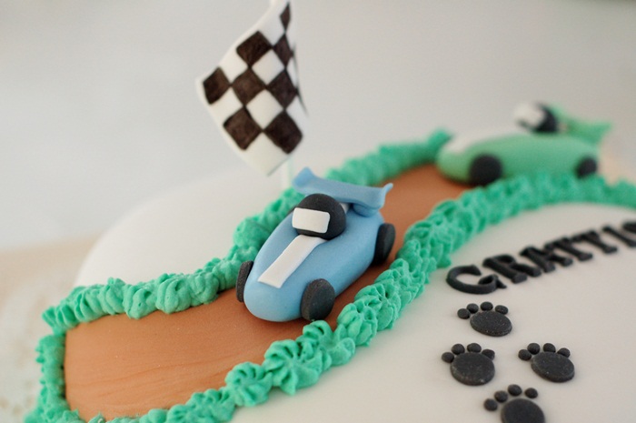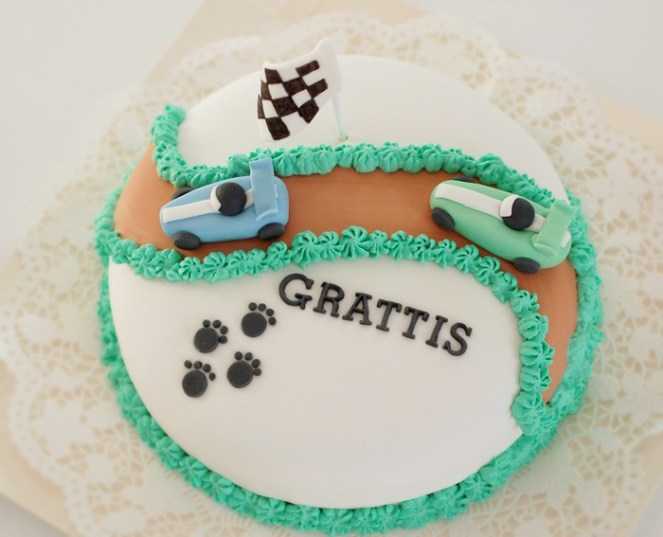För en liten stund sedan var Linda här och hämtade en födelsedagstårta som hon beställt till maken sin. Något med bil och kanske några tassar ville hon ha och såhär blev tårtan…