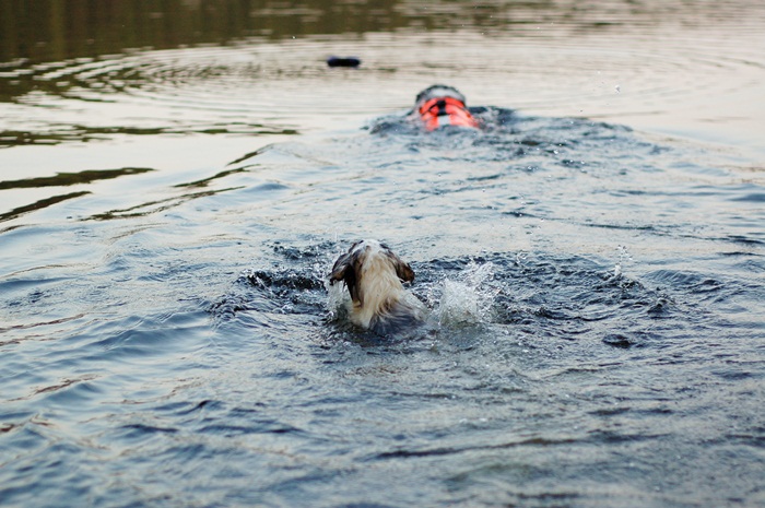 Nea förstod direkt att den nya flytvästen hjälpte henne och hon får upp och ner i vattnet för att simma ut och apportera. Funderar på hur man ska få henne att simma längre sträckor?? Tips tas gärna emot!!