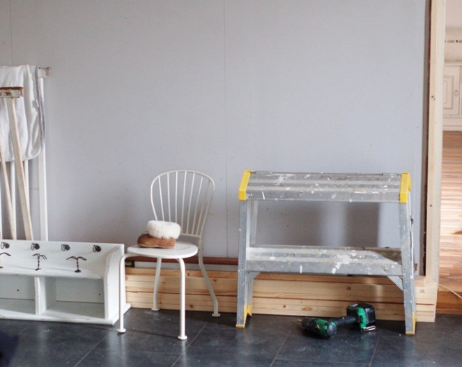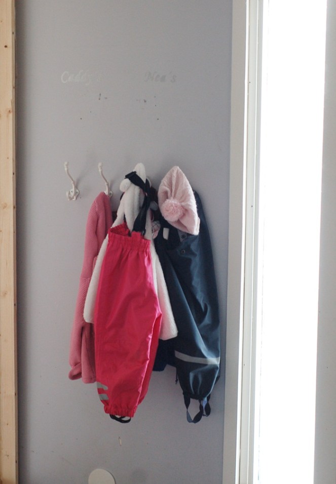 Först några riktigt dåliga före bilder då Mattias hann få ner nästan allt innan jag fick fram kameran, men jag kan säga att hela väggen var full av jackor, regnkläder och hundkoppel. Inte jätte charmigt precis….