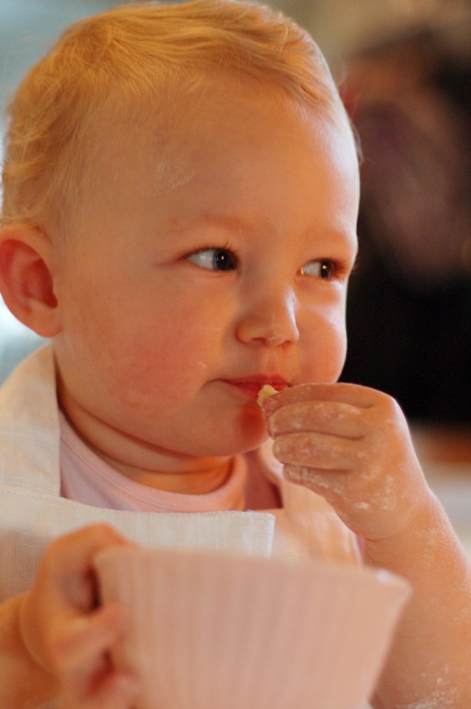När vi nästan var klara kom hon på att man kanske skulle ta och smaka på degen lite och vilken förvånad min hon gjorde samtidigt som hon stoppade munnen full…
