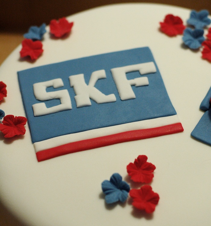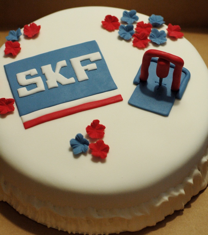 En glutenfri tårta till arbetskollegor på SKF med något som ska föreställa en enklare variant av en svarv