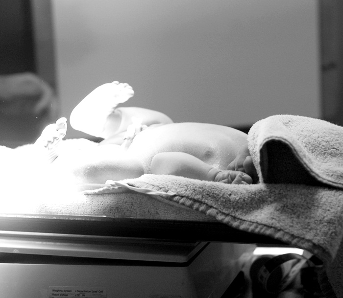 Theo ligger på vågen och blir vägd till 3330g och mätt till 49cm bara några minuter gammal…