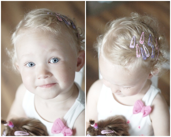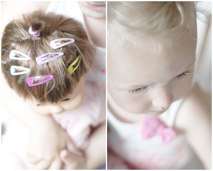 Tindra har fått nya hårspännen som vi förvarar i en burk och när hon vill ha ett hårspänne brukar jag ta fram burken så får hon välja själv och allt för ofta kan hon inte riktigt bestämma sig för ett utan vill ha flera. Igår var en sådan dag och hela håret pryddes med fina små spännen. Och eftersom Tindra är en mycket generös liten tjej så fick ju såklart dockan minst lika många…