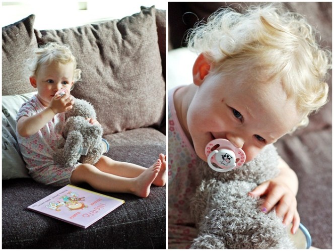 Ombytt och klar för sängen med nallen och favoritboken just nu ”Ingrid träffar djuren”