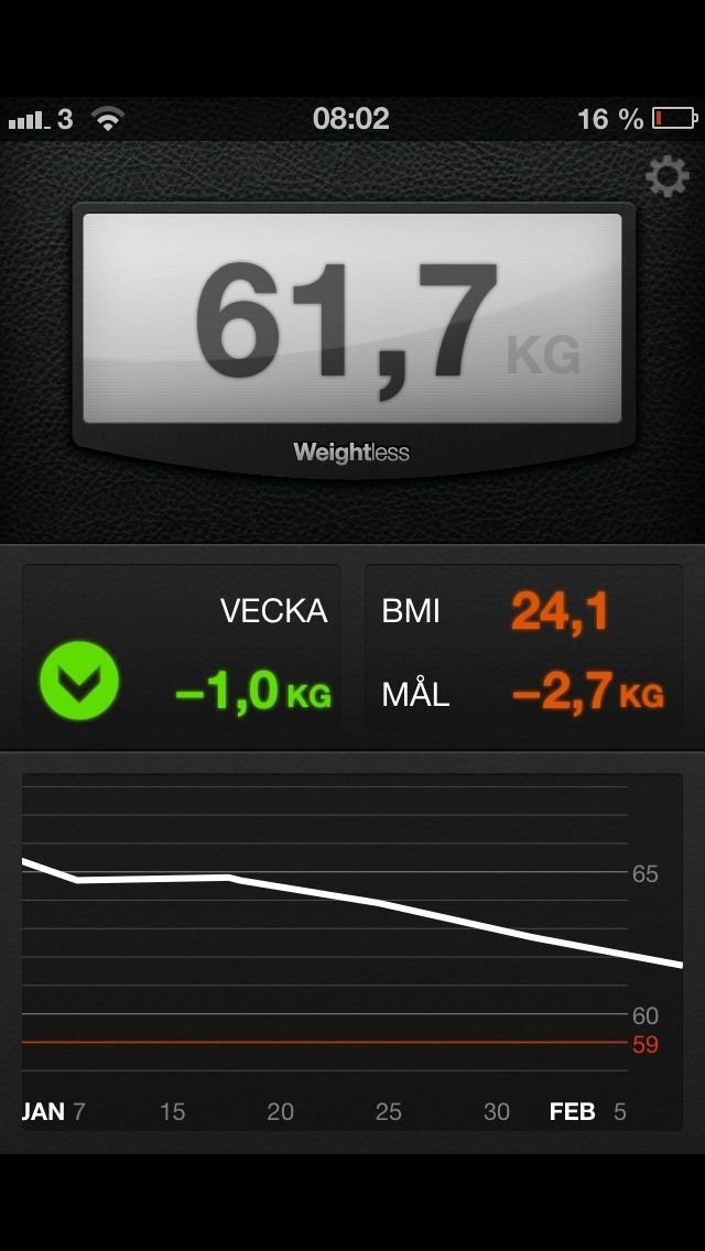 Förra veckans vikt glömde jag redovisa så vi börjar med den, 61,7 kg med en viktminskning på -1 kg!! Alldeles jätte glad var jag och nu känns det att jag närmar mig!