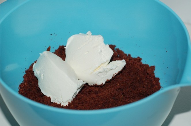 Börja med att baka en helt vanlig sockerkaka av smak man själv föredrar, funkar att köpa färdig också. Själv smular jag ner och fryser in om jag får över när jag skär våningar till tårtorna jag bakar. Smula som sagt ned sockerkaka i en bunke.