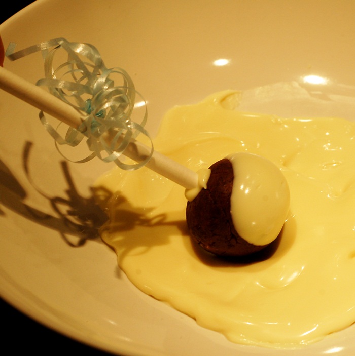 När chokladen har smält sätter du på en boll på din klubba och rullar tills den är täckt med choklad.