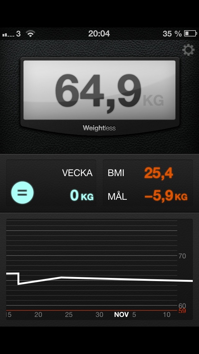 Bestämde mig förra veckan med lite inspiration av den HÄR tjejen och den HÄR tjejen att nu jäklar ska jag ta tag i det och få ordning på de där sista mammakilona!!! Ställde mig på vågen i morse med en liten förhoppning om ett minus och hoppsan hejsan vad glad jag blev! 64,3 kg vilket innebär -2,1 kg och jag har så gott som nått mitt delmål på en total viktminskning av -20 kg! Jag har äntligen kommit ner på ett bra BMI som hamna på 25,1 och från och med nu ligger jag återigen på normalvikt enligt skalan…